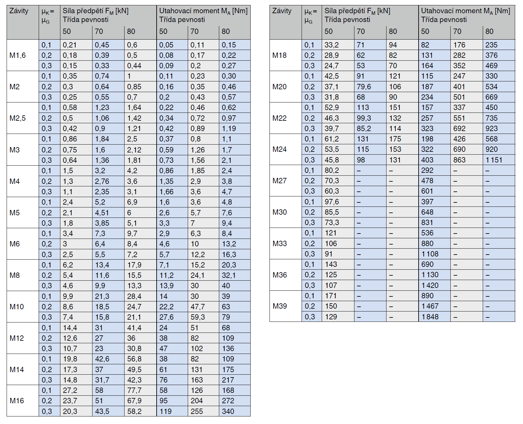 Síly předpětí / utahovací momenty (normální metrický závit) pro šrouby s dříkem třídy pevnosti 50/70/80 při 90 %-ním využití meze kluzu Rp0,2. Tabulka uvádí pouze maximální povolené hodnoty bez uvažování koeficientu bezpečnosti. Při práci s tabulkou se  předpokládá adekvátní znalost příslušných směrnic a kritérií pro dimenzování šroubových spojů.