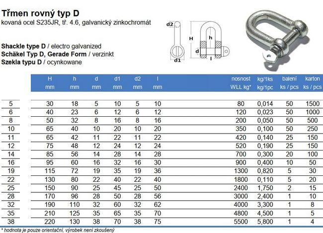 Třmen rovný typ D (zámek řetězu) nabízíme v 15-ti velikostech v rozměrové řadě 5mm – 38mm.