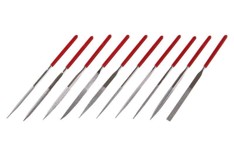 sada diamantových jemných pilníků - 10 kusů délka pracovní části 100 mm obsah sady - plochý, mečový, trojhranný, čtyřhranný, půlkulatý, kulatý, kopinatý použití - tvrdé materiály - ocel, tvrdokov, keramika, sklo, kámen Zobrazit více