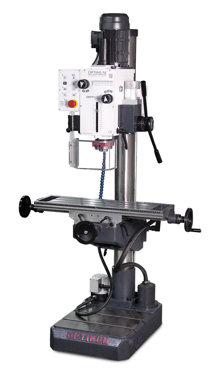 Převodová sloupová vrtačka s křížovým stolem pro frézování a vrtání se samostatným motorem strojního posuvu a s chlazením.