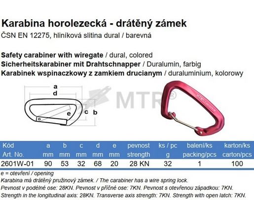 Karabina horolezecká s drátěným zámkem je vyrobena z tepelně zušlechtěné hliníkové slitiny (duralu). Karabina má drátěný pružinový zámek. Pevnost v podélné ose: 28KN. Pevnost v příčné ose 7KN. Pevnost s otevřenou západkou: 7KN. Největší vnitřní rozměry: 68 x 32mm. Největší vnější rozměry: 90 x 53mm. Světlost (maximální otevření): 20mm. Hmotnost: 32g. Vyrobeno v souladu s normou ČSN EN 12275.