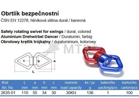 Obrtlík bezpečnostní - je vyroben z tepelně zušlechtěné hliníkové slitiny (duralu). Nosnost: 30 KN. Délka obrtlíku: 110mm, šířka: 55mm. Vnitřní šířka oka obrtlíku: 34mm. Vnitřní výška oka obrtlíku: 30mm. Vyrobeno v souladu s normou ČSN EN 12278.